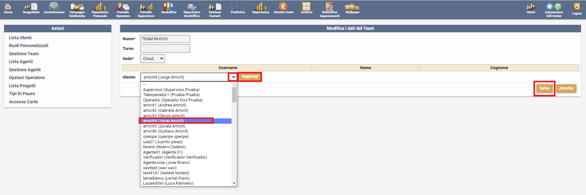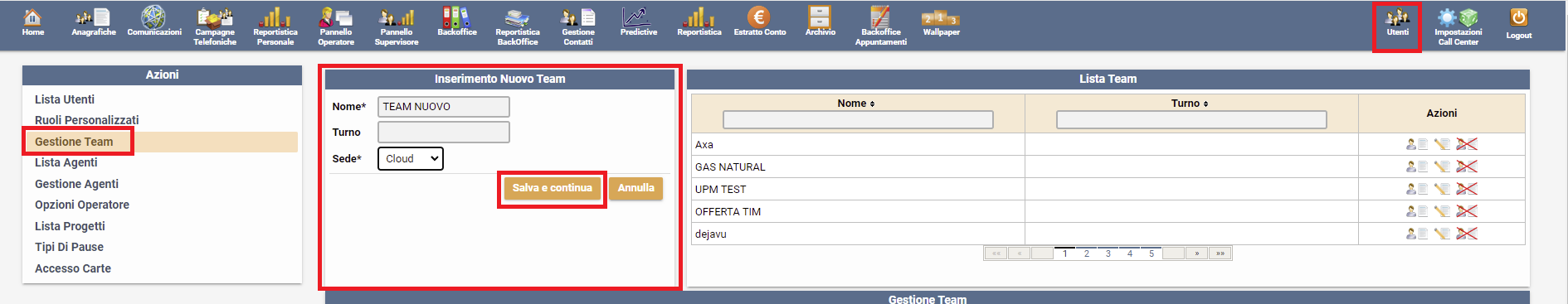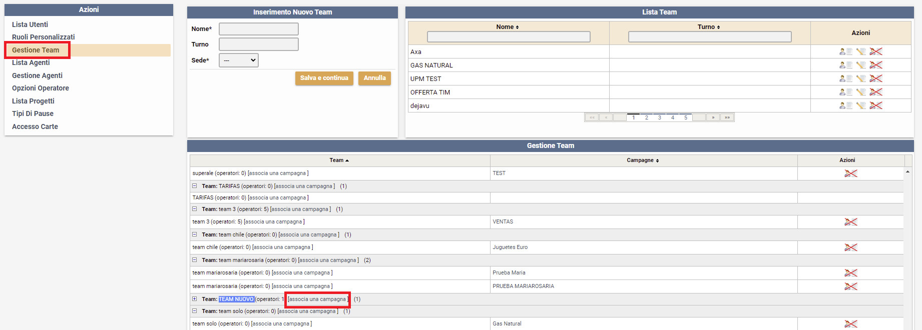 Per organizzare gruppi di lavoro e quindi fare in modo che alcuni operatori lavorino delle campagne specifiche ed altri altre campagne, ma senza poter visualizzare le lavorazioni altrui, bisogno creare dei TEAM: