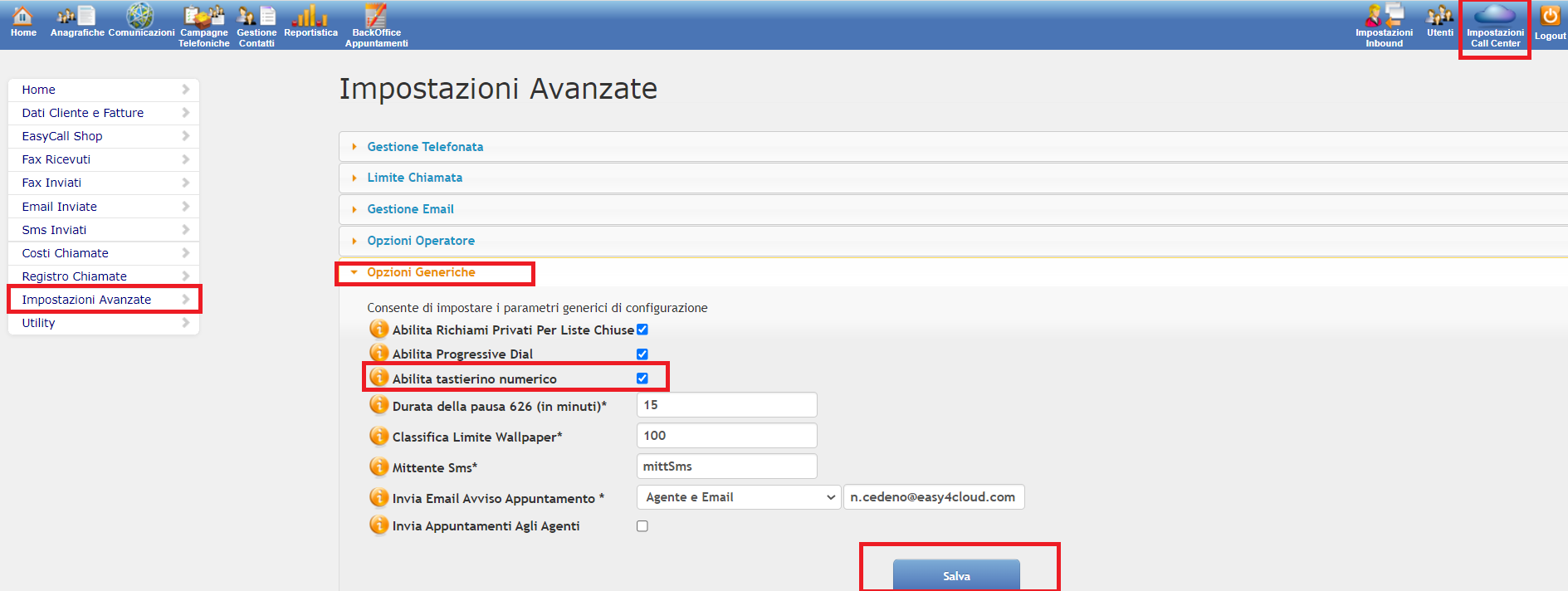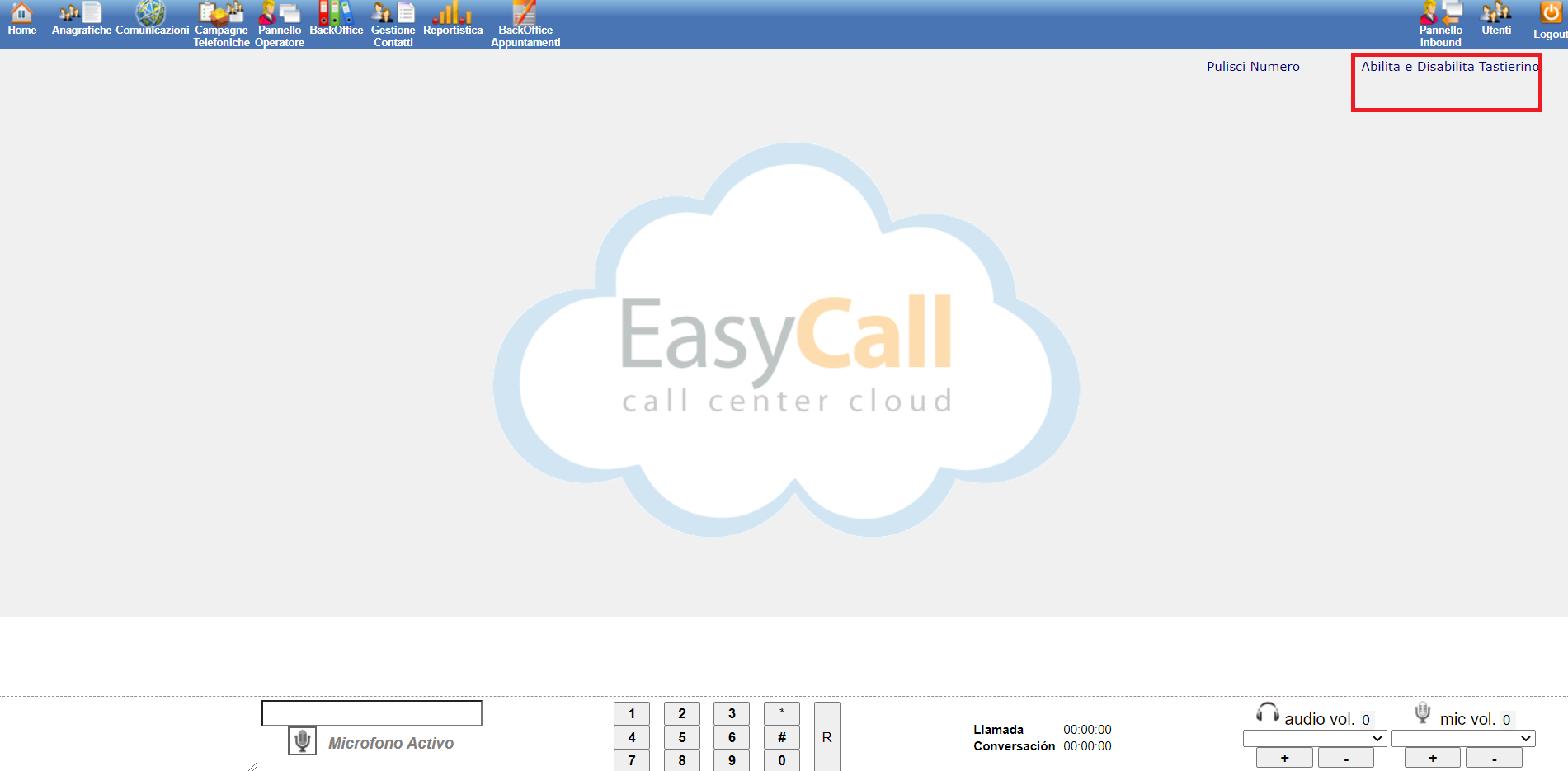 Se il tuo dominio è XXXXX.ecc1.easycallcloud.com Vai su: 1) IMPOSTAZIONI CALL CENTER 2) IMPOSTAZIONI AVANZATE 3) OPZIONI GENERICHE 4) ABILITA TASTIERINO NUMERICO Se il tuo dominio è XXXXX.web3.easycallcloud.com Vai su: 1) IMPOSTAZIONI CALL CENTER 2) ...