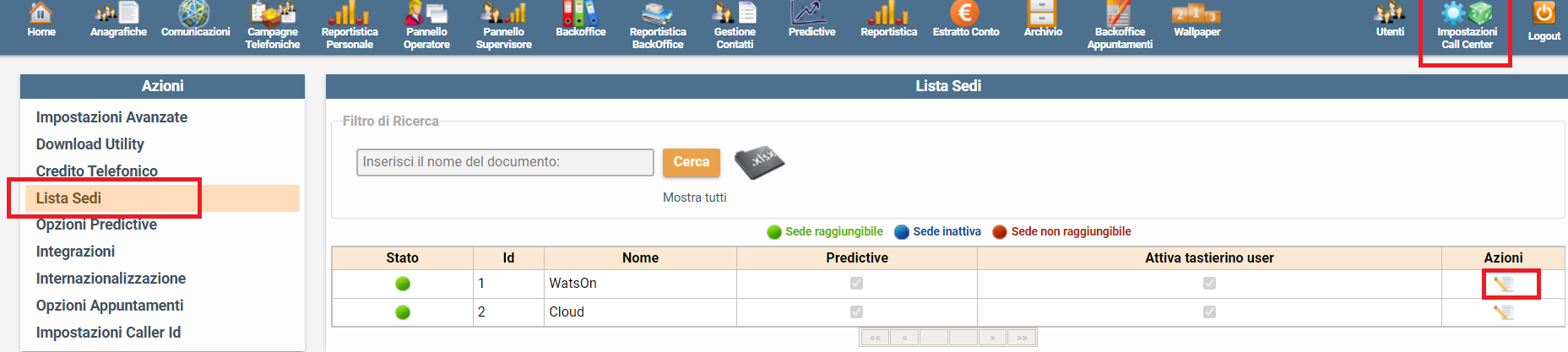 In questo caso andremo nella sezione Impostazioni Call center - Lista sedi e clicchiamo su modifica