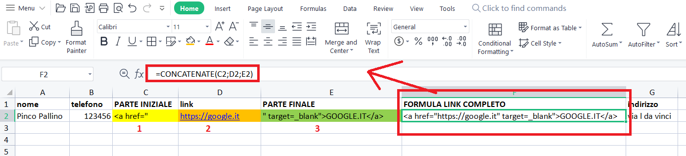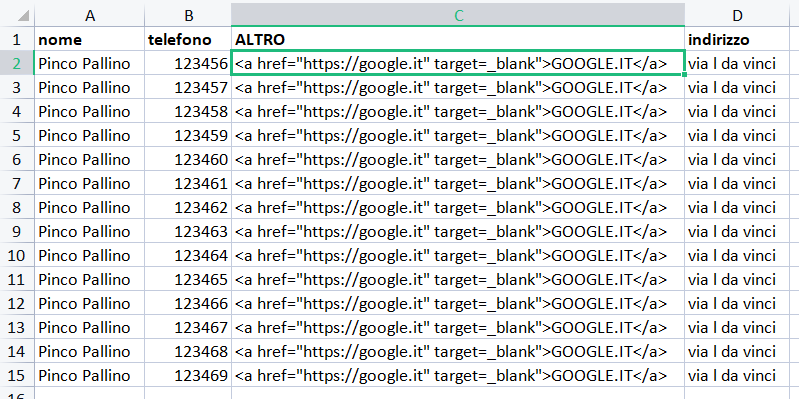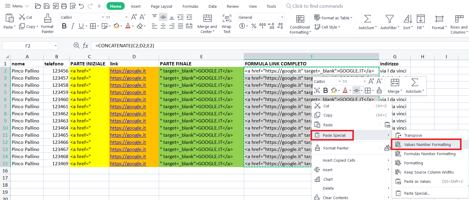 Eliminare quindi le colonne con la parte iniziale, il link e la parte finale e lasciare solo quella dove è già tutto concatenato.