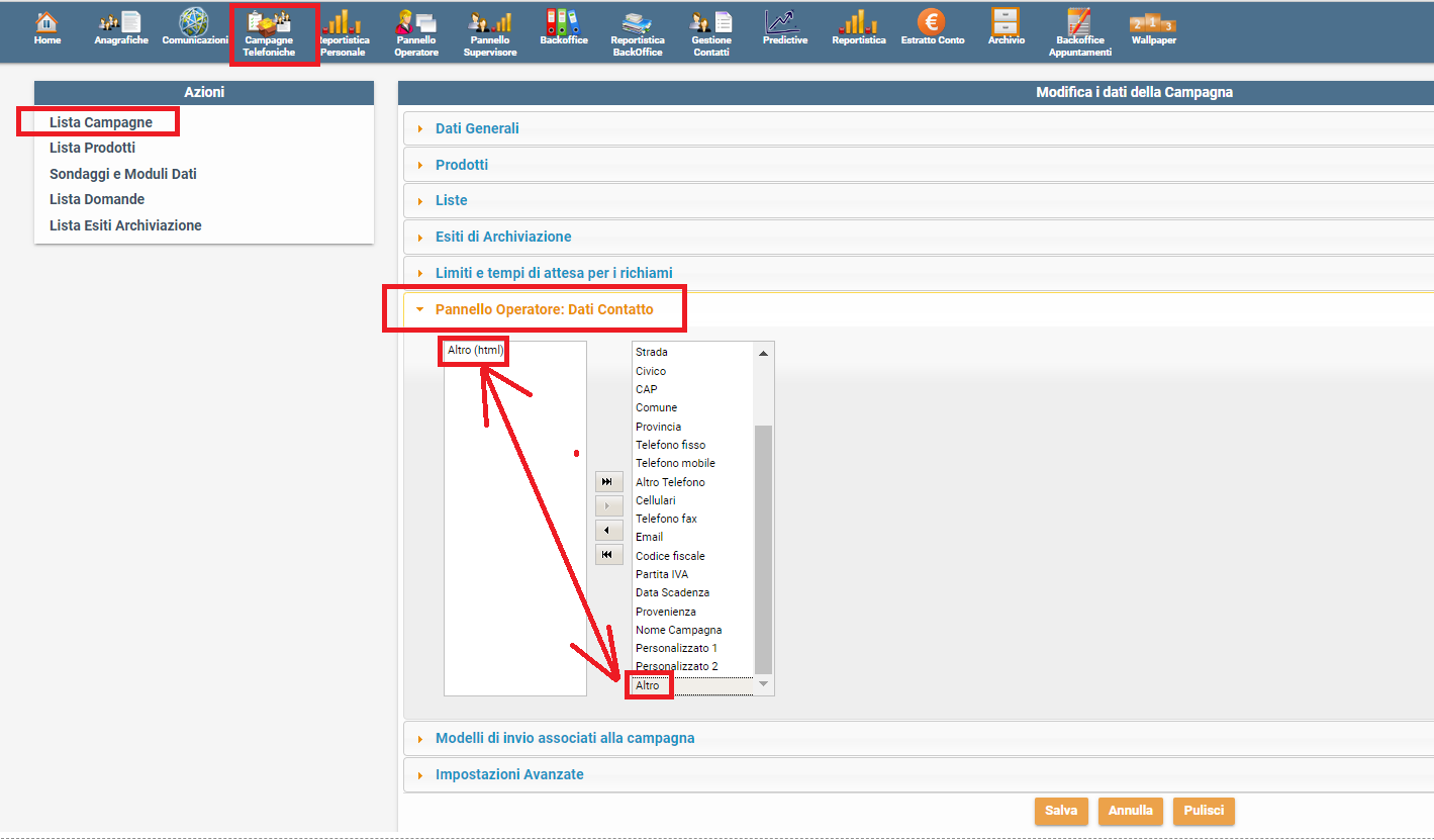 Entrare nella campagna telefonica come per modificarla e dirigersi su "Pannello operatore: Dati contatto"