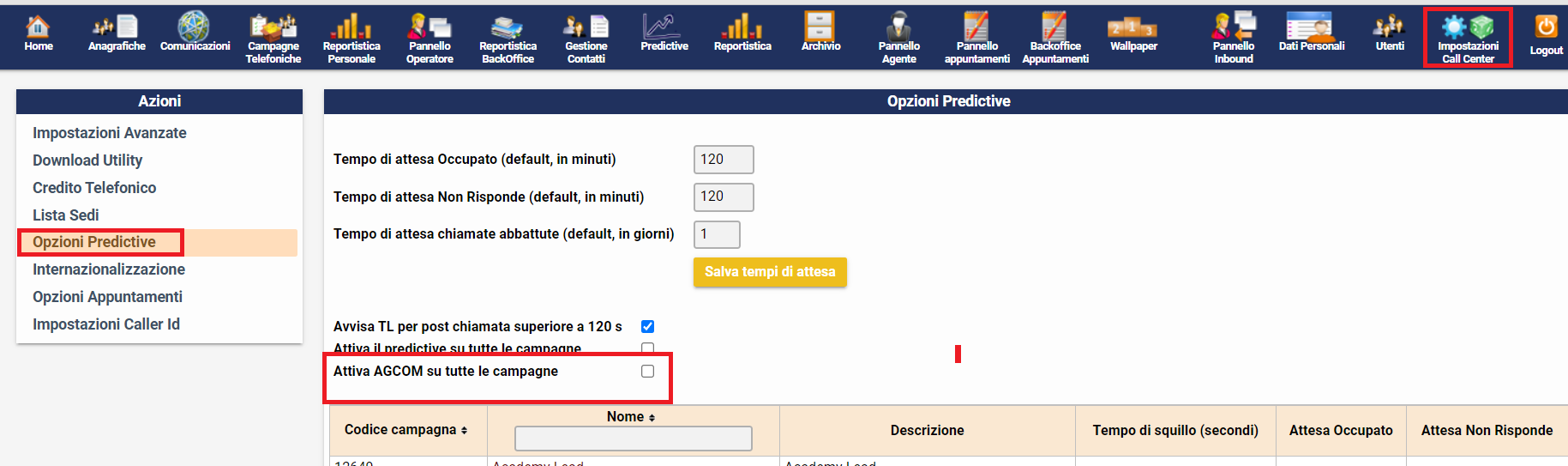 3) Cliccare sul nome della campagna desiderata e selezionare la modalità di chiamata che si vuole impostare