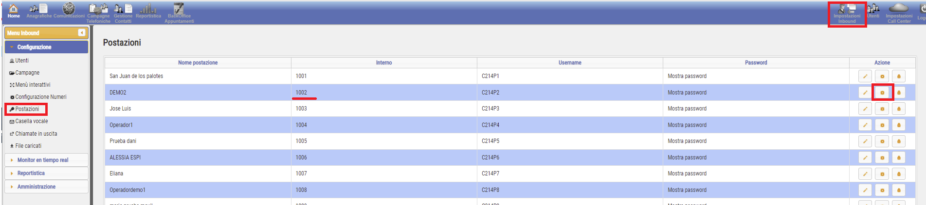 3) Andare su EasyCall --> PANNELLO INBOUND --> POSTAZIONI e cliccare sulla rotellina a destra, in azioni, "CONFIGURAZIONE SOFTPHONE"