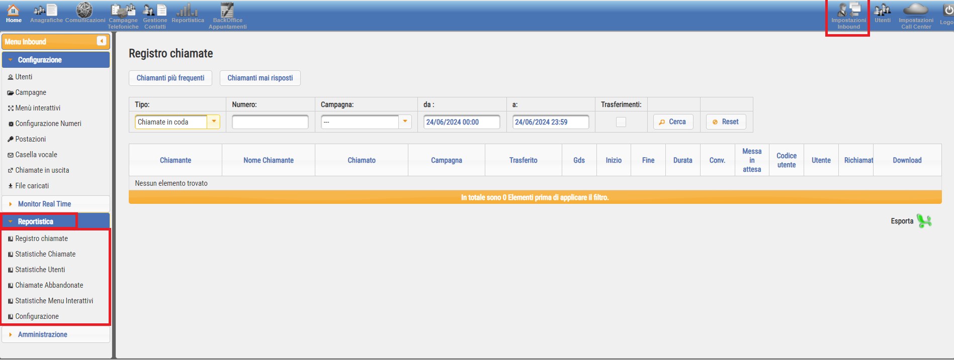 Questo report ci permette di visionare tutte le chiamate abbandonate, ossia le chiamate ricevute e a cui nessun utente ha risposto. Il motore di ricerca è composto dai seguenti campi: