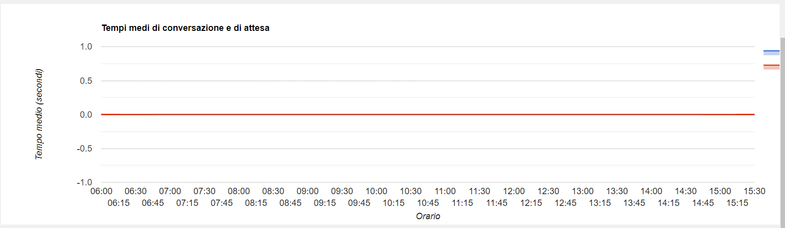 Sull'asse orizzontale troveremo sempre gli intervalli di tempo stabiliti dalla frequenza impostata. Sull'asse verticale invece il tempo medio espresso in secondi. L'area rossa corrisponde ai tempi di conversazione, quella blu ai tempi di attesa sulla coda.