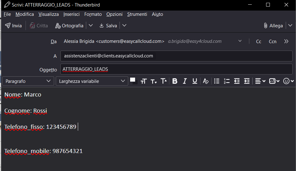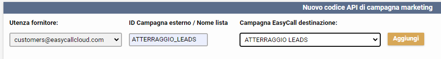 Si seleziona l'utenza MITTENTE(utenza fornitore), il codice campagna esterno(OGGETTO DELLA MAIL; deve essere il codice da comunicare ai vostri tecnici durante la configurazione della mail per l'atterraggio leads e, se composto da più parole, separarle con uderscore _ e non con lo spazio, come da esempio) e la campagna EasyCall di destinazione dei leads.