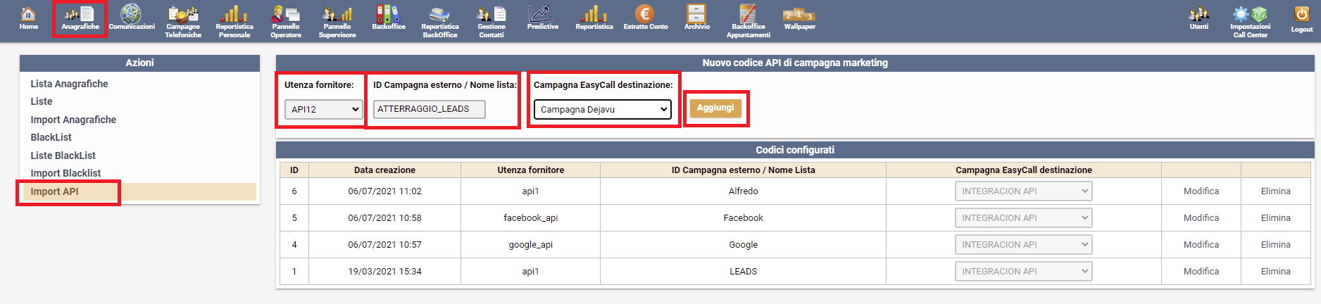 Per importare leads tramite E-MAIL si realizza una configurazione nella sezione ANAGRAFICHE -> Import API.