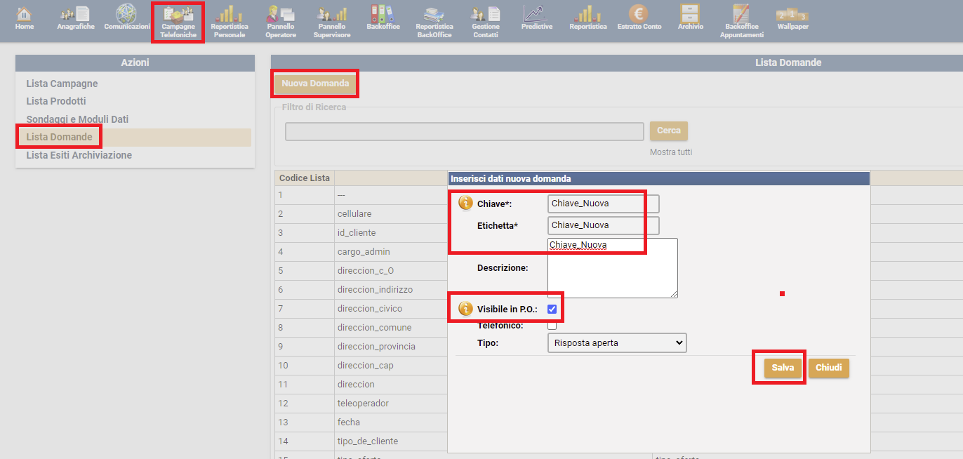 Esempio: chiave_nuova (con uderscore per unire), flagga "visibile in P.O." se hai bisogno che gli operatori la visualizzino nel pannello operatore, se non vuoi che la vedano, puoi anche non flaggarlo